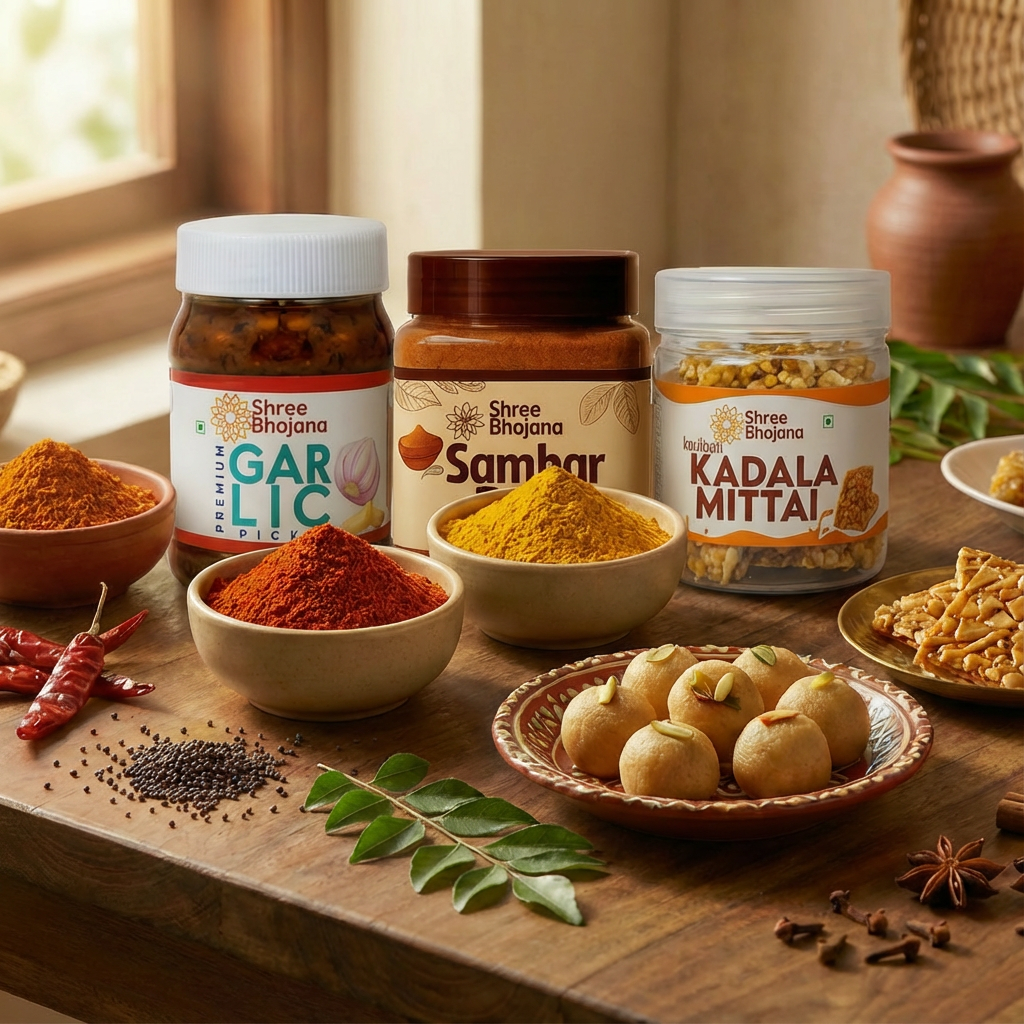 At Shree Bhojana, we believe in the timeless wisdom behind authentic Indian pickles, aromatic masala podis, and nostalgic handmade candies. While we honour the craft, care, and ingredients that shape every product, we also understand that food is deeply emotional—tied to memories, comfort, and home. Our mission is to bring you flavours that feel familiar, honest, and lovingly prepared, making every bite as meaningful as it is delicious.